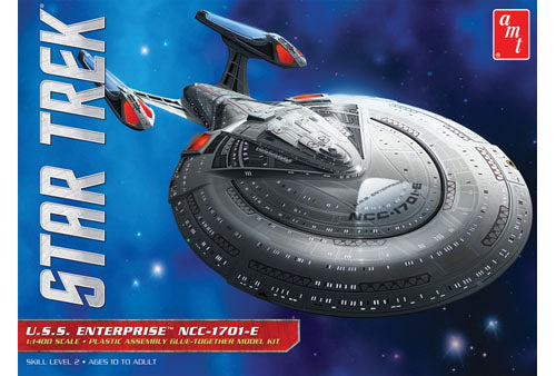 In 1996, the Enterprise-E made its first appearance in the film Star Trek: First Contact. The “E” shared many of the classic design elements of previous starships: twin nacelles, a saucer-like main section and torpedo-like engineering hull with deflector dish. This new version, however, featured a sleeker, more needle-like appearance, indicative of its advanced warp capabilities and enhanced weaponry. This DETAILED 1:1400 SCALE glue kit is 19″ long when assembled and includes decals and a display stand.