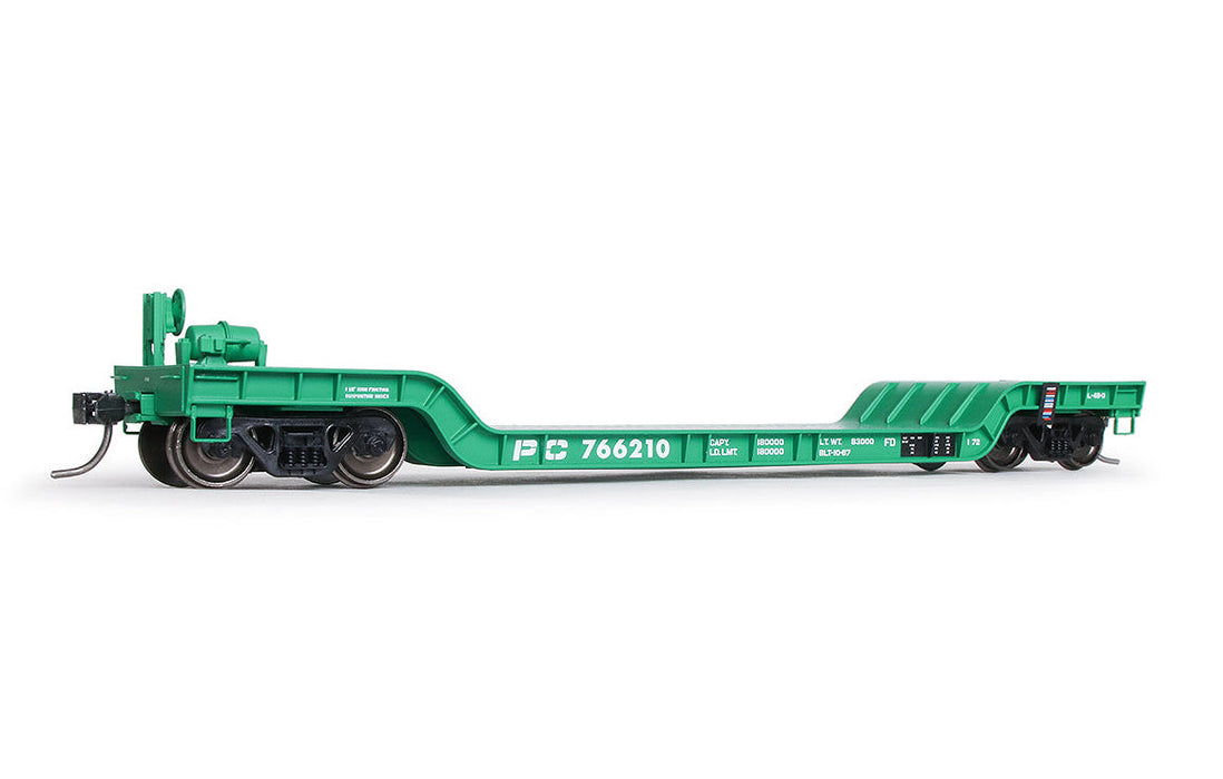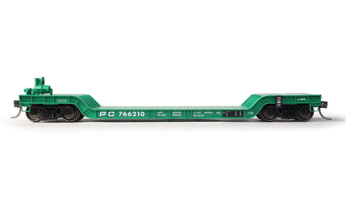 Given the rarity of all designs, ExactRail combined elements common to key prototypes to offer a Depressed Center Flat with both interesting and characteristic features. Perhaps closest in design to the Conrail (ex-Erie Lackawanna) FE42A Class Depressed Flat, ExactRail's Depressed Center Flat is a good stand-in for similar TTX/QTTX, NYC, UP, CR, & P&LE cars. With perforated GSI-style decks and intricately lettered car sides, ExactRail's 48' Depressed Center Flat will turn heads just like the prototypes.