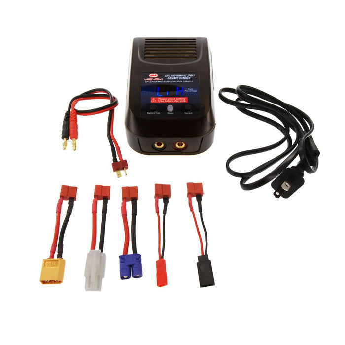 The Venom AC Sport Balance Charger is a peak detection charger that allows you to quickly and safely charge your LiPo, LiHV, LiFe, NiMH, and NiCd battery packs. The charger can charge 4, 5, 6, 7 and 8 cell NiMH and NiCd battery packs and balance charge 2, 3, and 4 cell LiPo, LiHV, and LiFe Battery packs at a user selectable rate of up to 3 amps. The Venom AC Sport Balance Charger includes a built-in power supply, charge status LED and LCD display to show the current percentage of charge. With a simple two button design, charging batteries has never been easier!