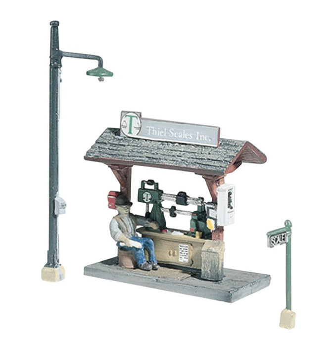 The scale attendant is taking a quick nap between trains. The scale is all set up and waiting, with a streetlamp for those late evening hours. The station sign sits out in front.