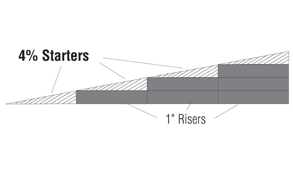 Incline Starters are wedges of high-density foam used to start your track on an incline or decline. Each piece in a package elevates/lowers the track to/from a designated number of inches within a 24 inch stretch, allowing for a smooth transition from one height to another. To install, pin in place with Foam Nails and attach with Foam Tack Glue™ or the Low Temp Foam Glue Gun and Glue Sticks. Use alone or with Risers.